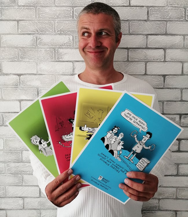 A set of four collectable original comedy illustrations featuring Magic Dave (created by Jay and Graham Hey).